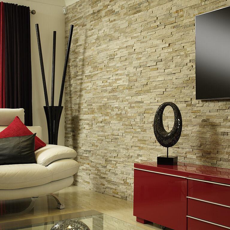 Its blend of oyster, beige, and pale gold tones enhances light and complements a wide range of colour schemes — from soft neutrals to bold contrasts. The interlocking 100x360mm panels are designed for quick and easy installation, delivering a seamless, grout-free finish that looks like hand-laid stone.
