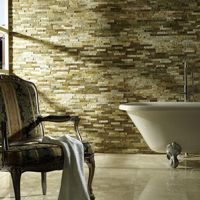 Oyster Split Face Slate Cladding 100x360mm features warm beige and golden tones in a textured split-face finish, ideal for creating bright, natural feature walls, fireplaces, and exterior façades.